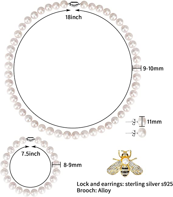 Real Freshwater Cultured Pearl Necklace and Earring Set for Women, AAA Quality Pearls Necklaces with Earrings and Bracelet Jewelry Gifts Sets for Anniversary, Wedding and Birthday.